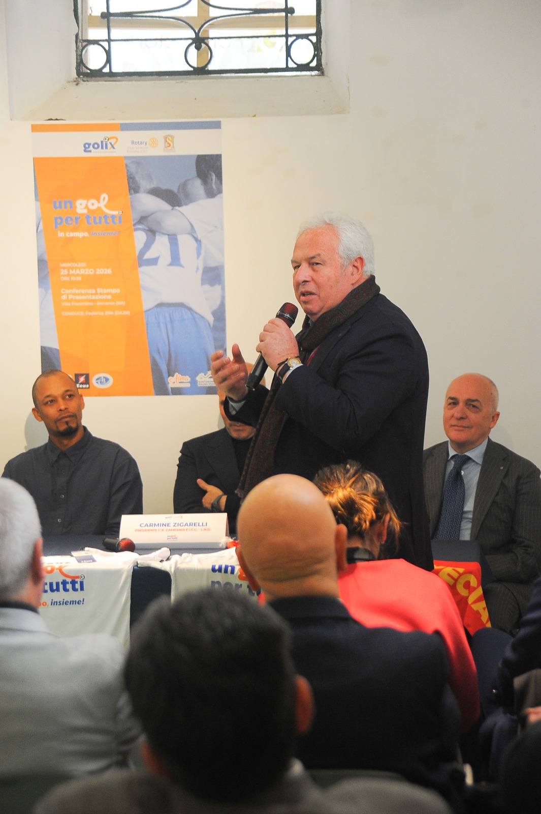 Ad illustrare i dettagli de “Un gol per Tutti” il direttore di Golix.it, Antonio Di Martino, il presidente del Rotary Club Sorrento, Claudio de Vito, il presidente del Comitato Regionale Campania Lnd – Figc, Carmine Zigarelli e l’ex calciatore del Napoli, Fabiano Santacroce. Dopo il benvenuto del ceo di Fondazione Sorrento, Gaetano Milano ed i saluti del presidente nazionale dell’Unione stampa sportiva italiana, Gianfranco Coppola, gli interventi moderati dalla giornalista sportiva di Dazn, Federica Zille. “Abbiamo realizzato una serie di maglie brandizzate per l’occasione che stanno andando in giro per l’Italia e l’Europa per essere autografate da campioni del calcio, sportivi di livello internazionale, rappresentanti della stampa e delle istituzioni – spiega il direttore Di Martino -. Poi si organizzerà una grande asta di beneficenza ed i fondi raccolti saranno devoluti all’ospedale Santobono Pausilipon e ad altri enti”. “Siamo felici di essere stati coinvolti in questa iniziativa – commenta il presidente de Vito -. Per la nostra istituzione la solidarietà è la principale mission ed è importante contribuire all’inserimento nella società dei ragazzi con disabilità”. Il Rotary, infatti, nell’ambito dell’evento, raccoglierà donazioni a sostegno di “Alma Cooperativa Sociale”, organizzazione della penisola sorrentina dedita alla promozione dell’inclusione. Il presidente Zigarelli ha rimarcato “l’importanza di aver lanciato il campionato for special”, mentre Santacroce ha ammesso che “vedere il sorriso di questi ragazzi mentre giocano e si divertono su un campo di calcio regala un’emozione indescrivibile”.