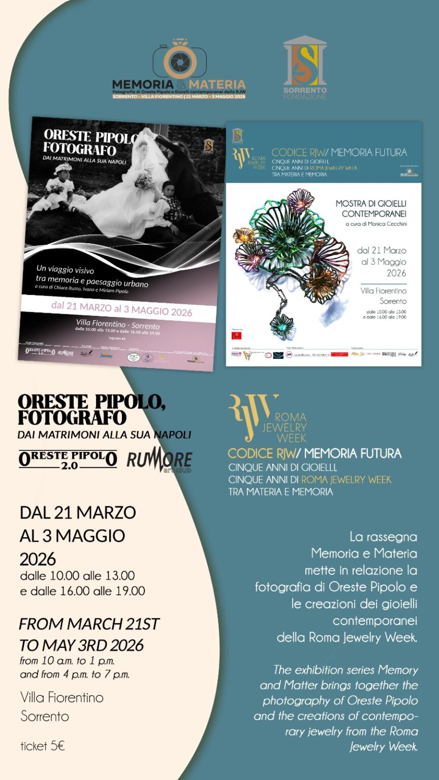 The cultural project “Memoria e Materia,” promoted by the Sorrento Foundation, has been launched with the aim of showcasing contemporary artistic and photographic heritage. From March 21 to May 3, 2026, the stunning setting of Villa Fiorentino will host a dual event: the photography exhibition “Oreste Pipolo: From Weddings to His Naples,” a visual journey through memory, tradition, and the urban landscape, and the exhibition “Codice RJW / Memoria Futura,” which takes visitors on a journey through the world of contemporary jewelry, blending art, experimentation, and research.